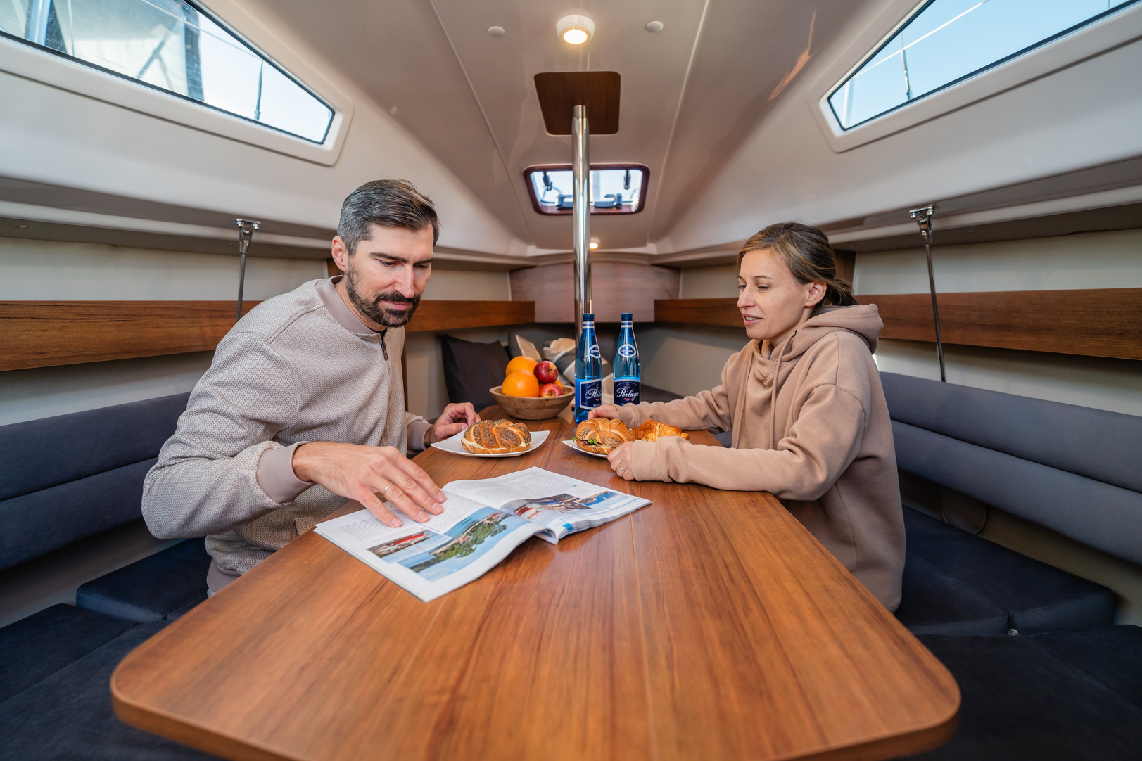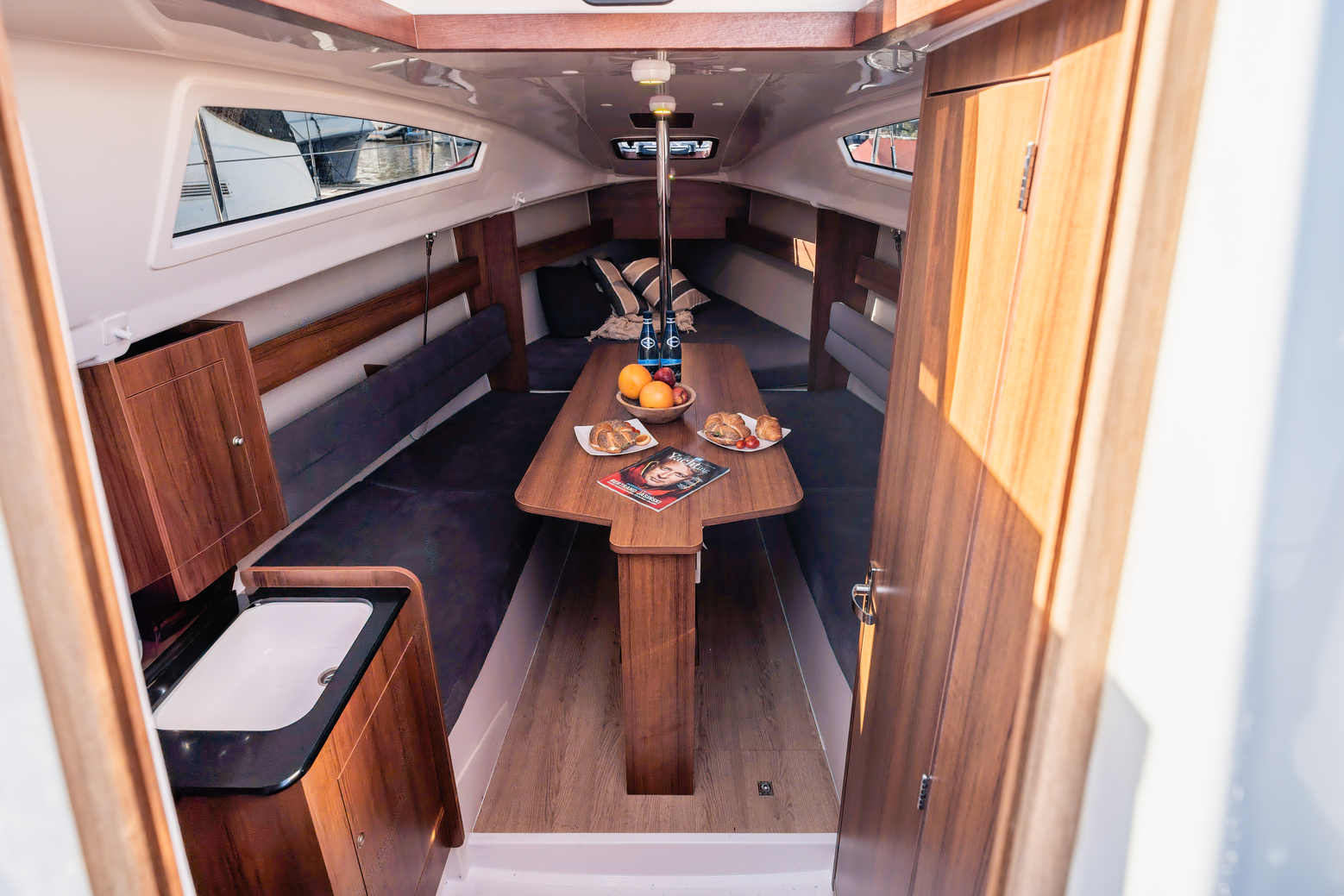 - Stół w kabinie - długi stół przy aneksie kuchennym z sześcioma miejscami do siedzenia, który można częściowo złożyć, aby uzyskać dwa dodatkowe miejsca do spania
